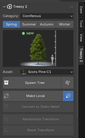 Treezy comes in two separate zip files. One includes the addon, while the other contains the Treezy library, comprising models, textures, materials and node groups.