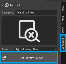 With the addon installed and enabled, the Treezy panel will appear in the side panel of the 3D view (shortcut N). However, it is not yet functional, and you must set the library directory for it to work properly. Click on Set Library Folder to proceed.