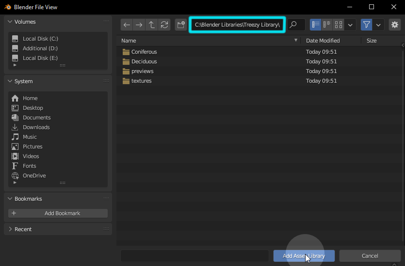 Use the file browser to navigate to the directory where you extracted the Treezy library (make sure the path includes the library folder itself) and click on Add Asset Library