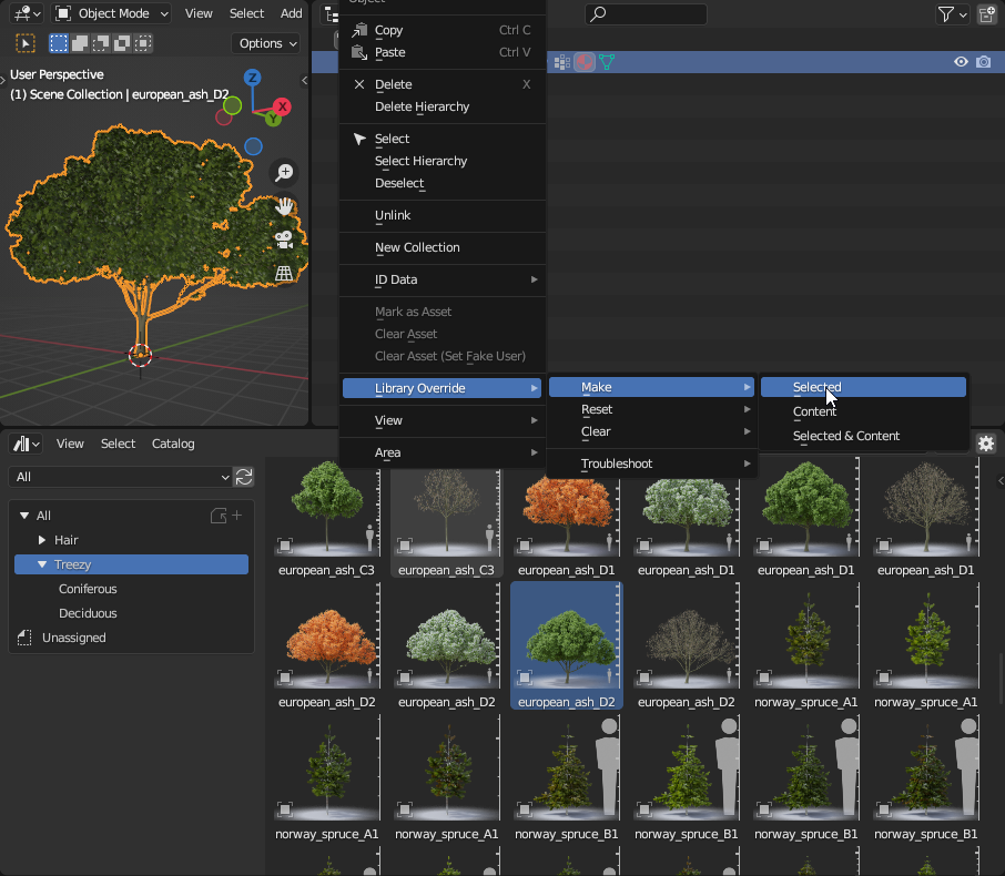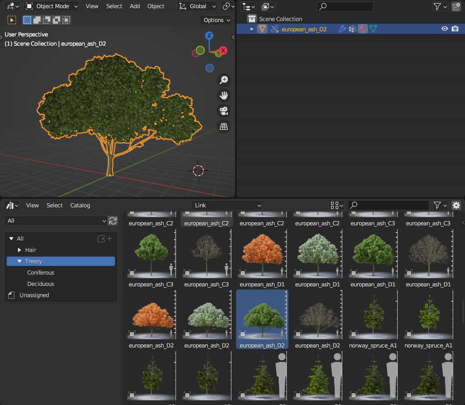 Head over to the Blender Asset Browser and the assets will be inside the Treezy catalog organized by category.